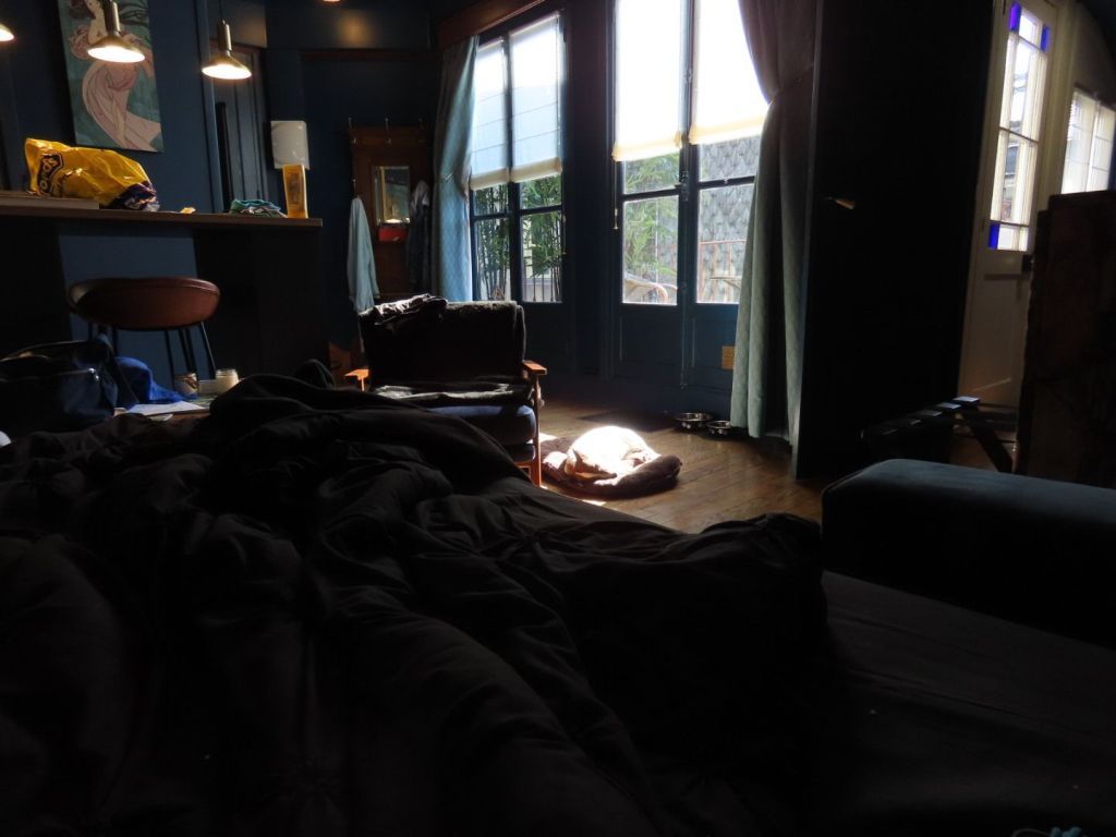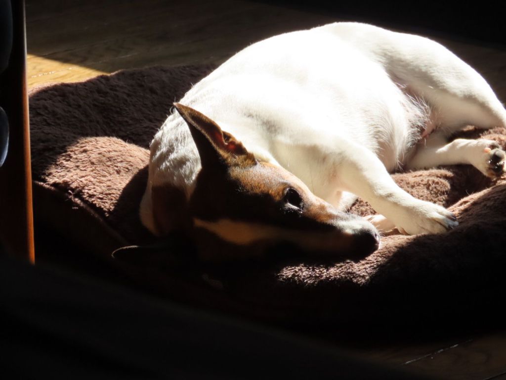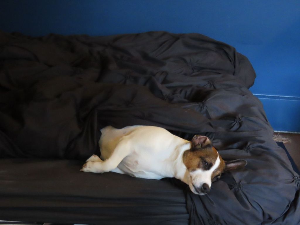 This pup certainly fell on all four of her paws when she came to us. A lazier more contented terrier would be hard to find. She was a little disconcerted to see a larger version of ‘four paws’ in the window of the reception for the appartment though.