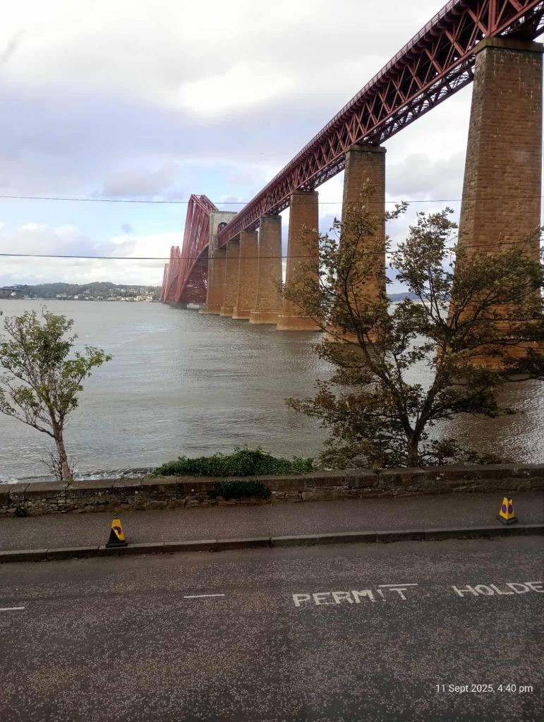 Having navigated our way from the station down to sea level we are not at all impressed with the route to catch a bus or train. Stroppy knees and bonky hip do not need upsetting already. We might swim the Forth. But that would be showing off! And the rucksacks might not float.